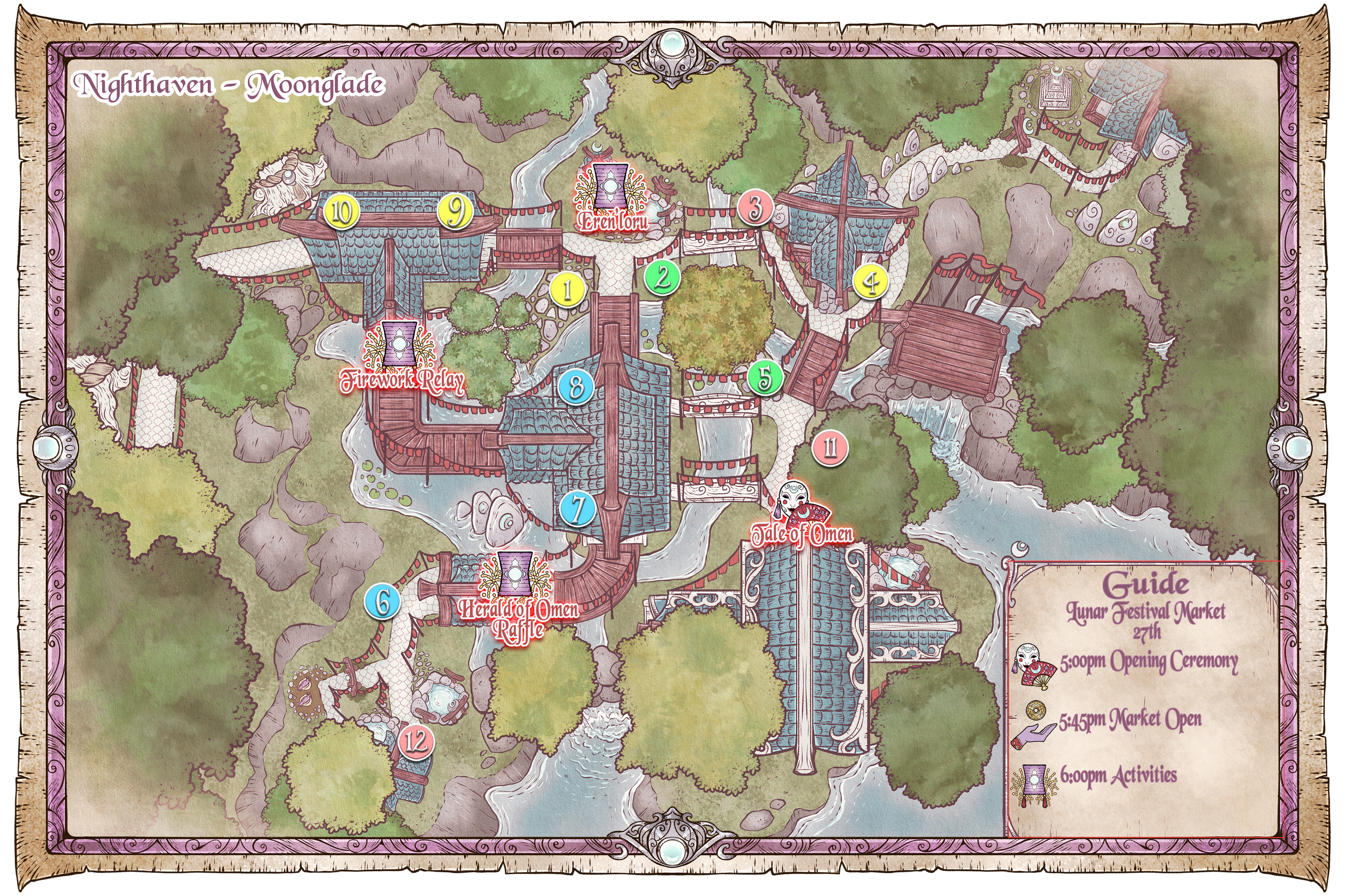The Lunar Festival Market brings together artisans, cooks, and performers from across Azeroth for a night of lively, in-character commerce and social roleplay in Nighthaven. Stalls offer festival foods, handcrafted wares, charms, trinkets, and interactive experiences, creating a bustling space to browse, trade, and mingle beneath lantern-lit boughs. Whether you’re here to shop, share stories, or simply wander the market paths, the Lunar Festival Market is the heart of the celebration.To register a stall, please contact Feyawen via Discord.Vendors who wish to set up their stall for the second night of the Lunar Festival are welcome to do so.STALL EXAMPLES